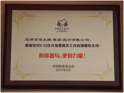 2011年5月中國扶貧基金會感謝昆百大集團5.12汶川地震救災工作的捐贈和支持!有你參與,更有力量!