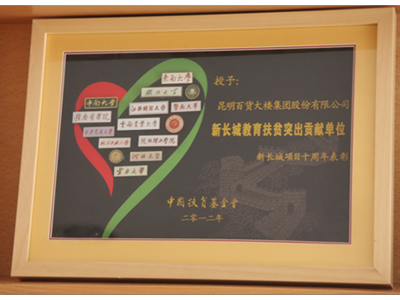 2012年中國扶貧基金會授予昆百大集團新長城教育扶貧突出貢獻單位獎項