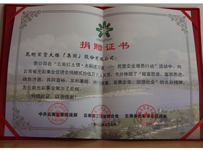 2012年“云南紅土情 光彩進萬家——民營企業(yè)感恩行動”活動捐款25萬元的捐贈證書