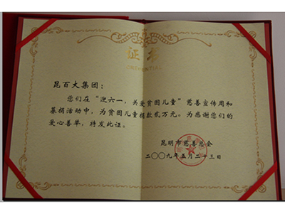 2009年昆明市慈善總會頒發(fā)“迎六一關愛貧困兒童”捐款貳萬元證書